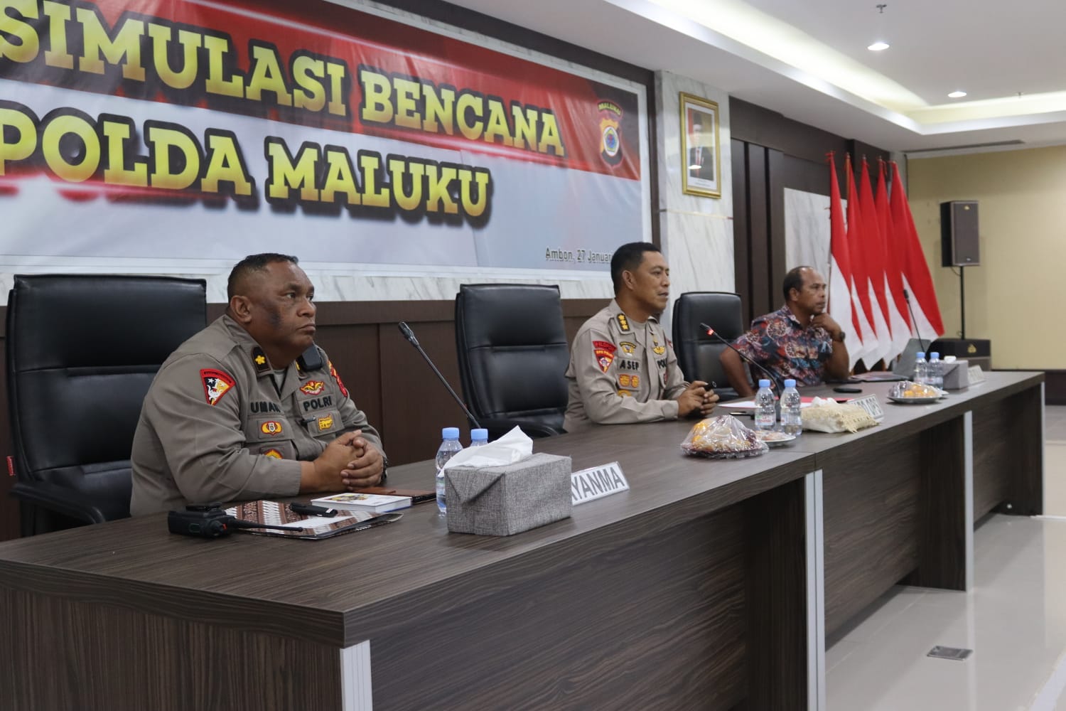 Malukuexpress.com, POLDAMALUKU- Kepolisian Daerah Maluku menggelar Tactical Floor Game (TFG) simulasi saat menghadapi bencana alam. Simulasi digelar di ruang rapat utama Polda Maluku, Jumat (27/1/2023).