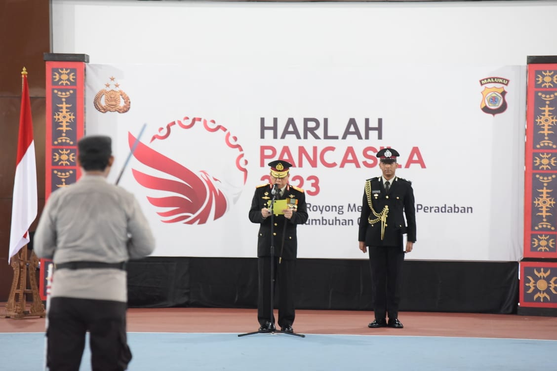 MALUKUEXPRESS.COM, POLDAMALUKU- Kepolisian Daerah Maluku menggelar upacara peringatan hari lahir Pancasila, Kamis (1/6/2023). Upacara sedianya dilaksanakan terbuka di Lapangan Upacara Polda Maluku Letkol Pol (Purn) Tahapary Ambon. Namun karena hujan yang mengguyur Kota Ambon dan sekitarnya sejak pagi tadi, akhirnya diputuskan dilaksanakan di Gedung Sport Center Polda Maluku.