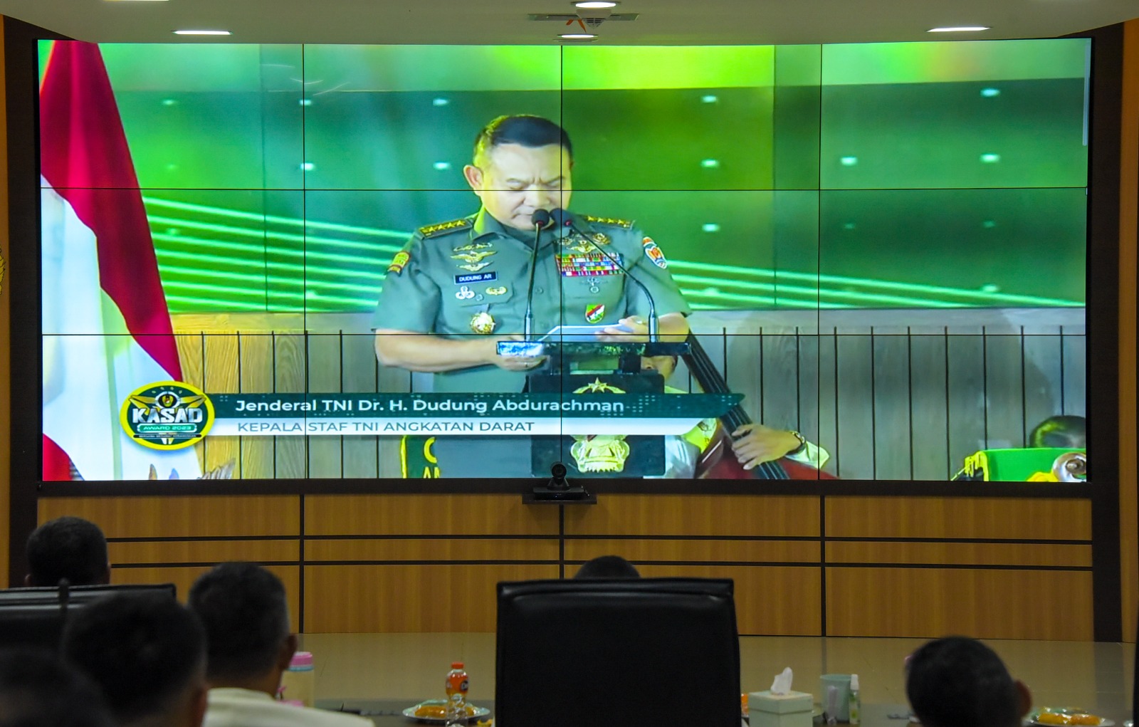Pangdam XVI/Pattimura Mayjen TNI Ruruh A. Setyawibawa S.E., M.M., para pejabat Kodam bersama Forkopimda Maluku dan beberapa perwakilan dari awak media, menyaksikan Live Streaming Kasad Award tahun 2023, bertempat di ruang vicon Mapolda Maluku.