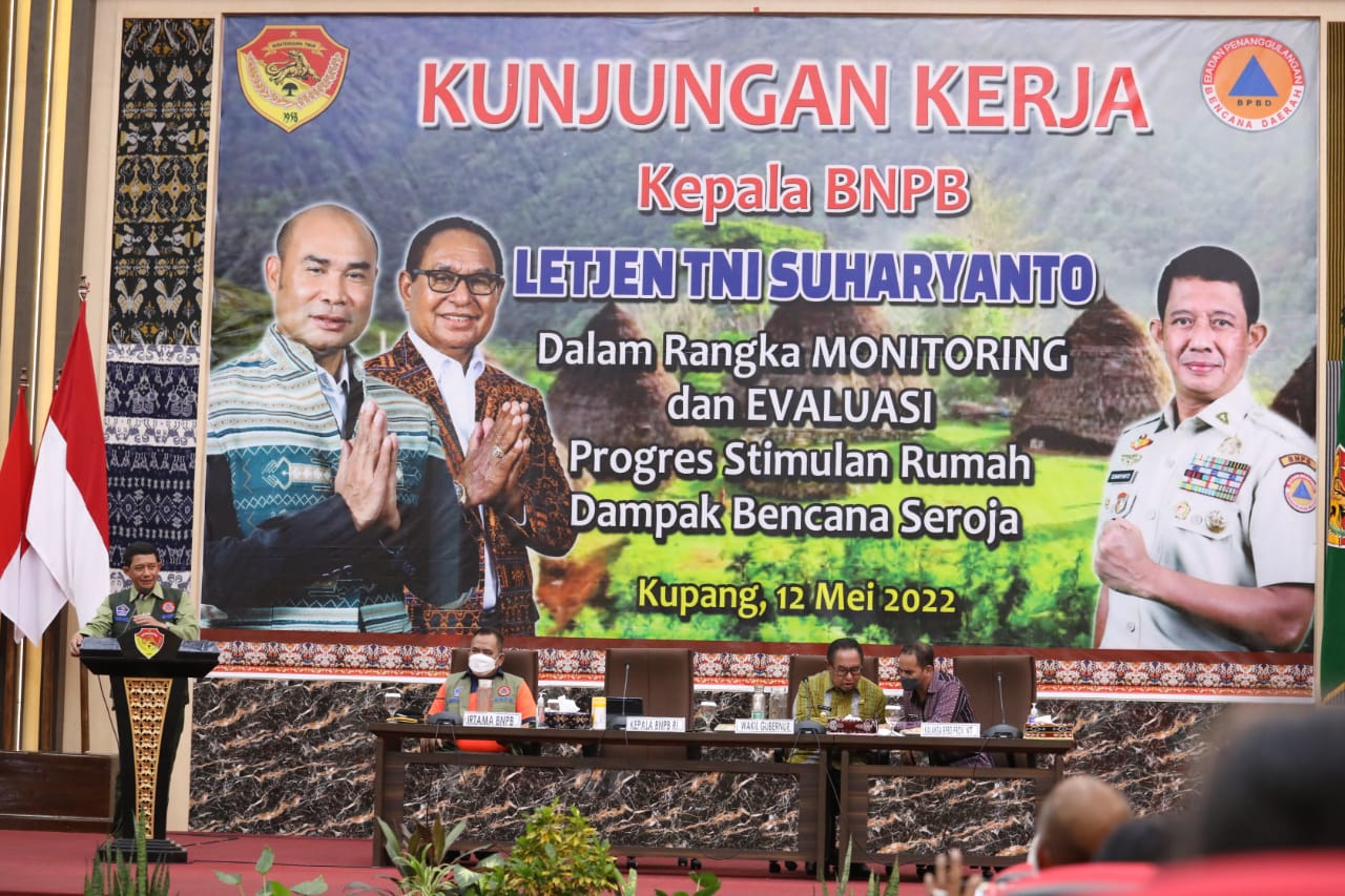 KUPANG – Kepala Badan Nasional Penanggulangan Bencana (BNPB) Letjen TNI Suharyanto memimpin rapat koordinasi percepatan pelaksanaan bantuan stimulan BNPB dalam perbaikan rumah pascabencana siklon tropis seroja di Aula Kantor Gubernur, Kupang, Nusa Tenggara Timur (NTT), Kamis (12/5).