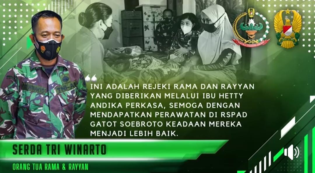 Seluruh upaya yang diberikan kepada Rama dan Rayyan merupakan bentuk perhatian pimpinan tertinggi TNI Angkatan Darat kepada anggota dan keluarga, semoga diberikan hasil terbaik untuk kesehatan kedua kakak beradik ini dan bisa kembali berkumpul bersama orang tua dan adik bungsu mereka.