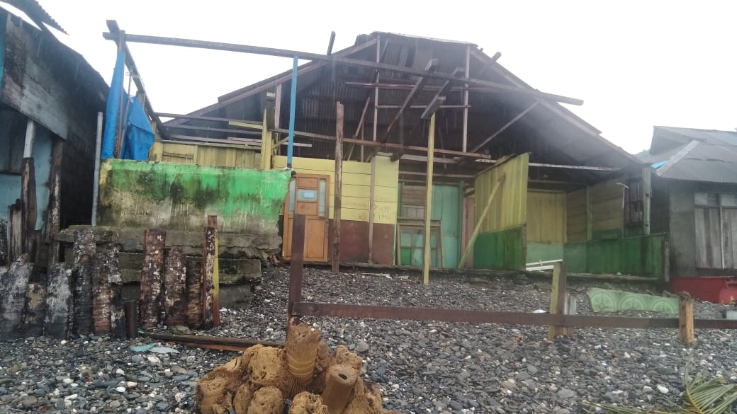 Rumahan warga yang mengalami kerusakan berat mencapai 20 kepala keluarga (KK) akibat bencana alam yang terjadi beberapa Minggu terakhir ini, terutama kami yang dekat tinggal di pinggir pantai, rumah warga yang terdampak bencana alam terpaksa harus melalukan rehab tiang rumah dengan mengunakan pohon kelapa.