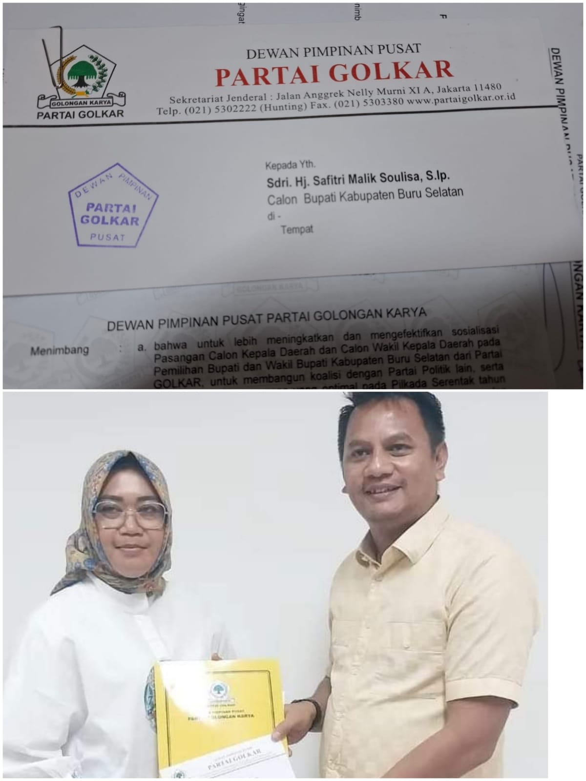 Rekomendasi dari Partai Beringin itu diberikan kepada Safitri Malik Soulisa sebagai Calon Bupati berpasangan dengan Hanfri Lesnussa sebagai Calon Wakil Bupati.