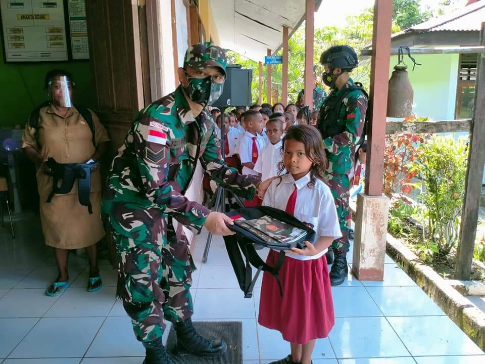 Malukuexpress.com, Dalam rangka memperingati HUT ke-76 Tentara Nasional Indonesia (TNI), Satgas Yonif 512/QY yang sedang bertugas di daerah perbatasan guna menjaga kedaulatan Negara Kesatuan Republik Indonesia (NKRI) serta patok batas wilayah NKRI, turut serta merayakannya dengan membagikan buku beserta tas sekolah kepada anak-anak yang berada di SD Negeri Arso PIR IV Kabupaten Keerom, Papua, Selasa (5/10/2021).
