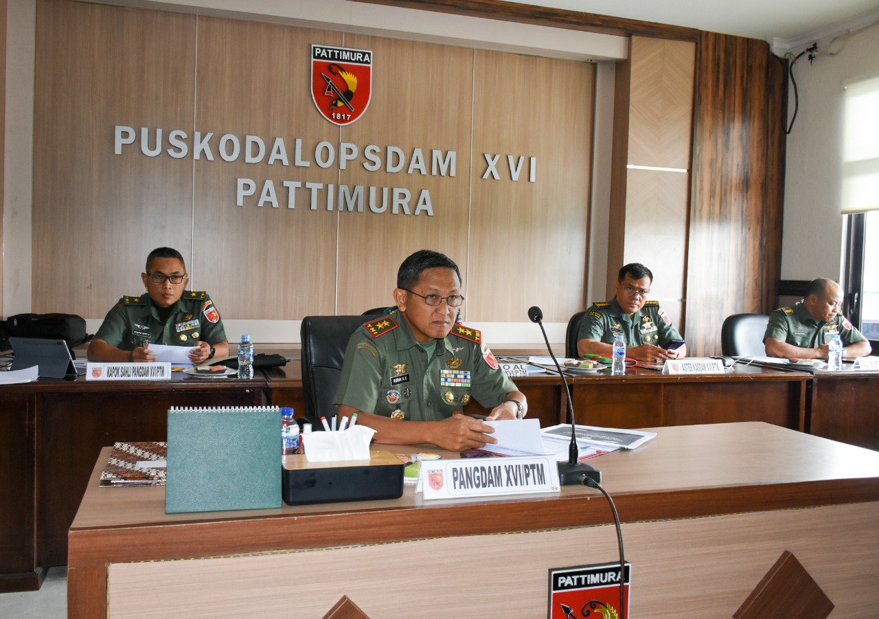 Malukuexpress.com, Pangdam XVI/ Pattimura, Mayjen TNI Ruruh A. Setyawibawa, S.E., M.M. didampingi Kapoksahli Pangdam, Brigjen TNI Syaepul Mukti Ginanjar, Aster Kasdam XVI/ Pattimura, Perwira LO AL dan Kapendam XVI/ Pattimura mengikuti sarasehan hasil Ekspedisi Jala Citra 2- Banda secara virtual di ruang Puskodalopsdam XVI/ Pattimura, Kamis (01/12/22).