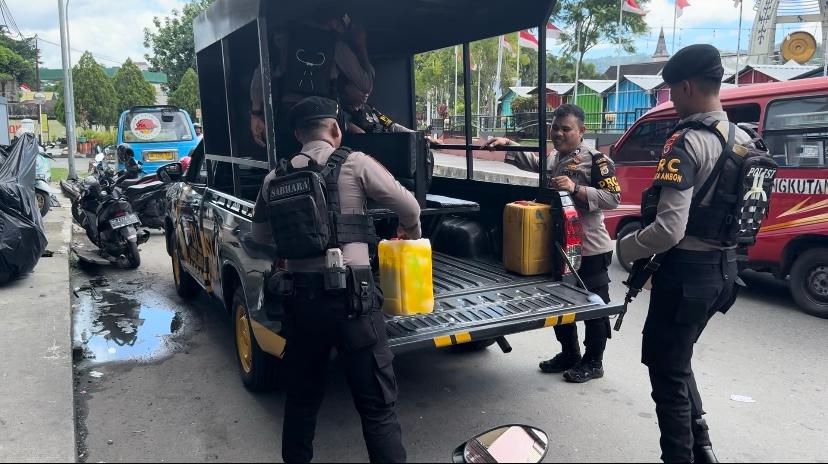 AMBON,MALUKUEXPRESS.COM-Satuan Samapta Polresta Ambon melaksanakan patroli dialogis di seputaran Kota Ambon, yang merupakan salah satu langkah preventif dalam menjaga keamanan dan ketertiban masyarakat. Pada pelaksanaan patroli tersebut, personil Sat Samapta menemukan barang bukti minuman keras (Miras) sebanyak 35 liter yang disimpan dalam jirigen di dan disembunyikan di salah satu lokasi di Pasar Lama, Selasa (13/12/2023).