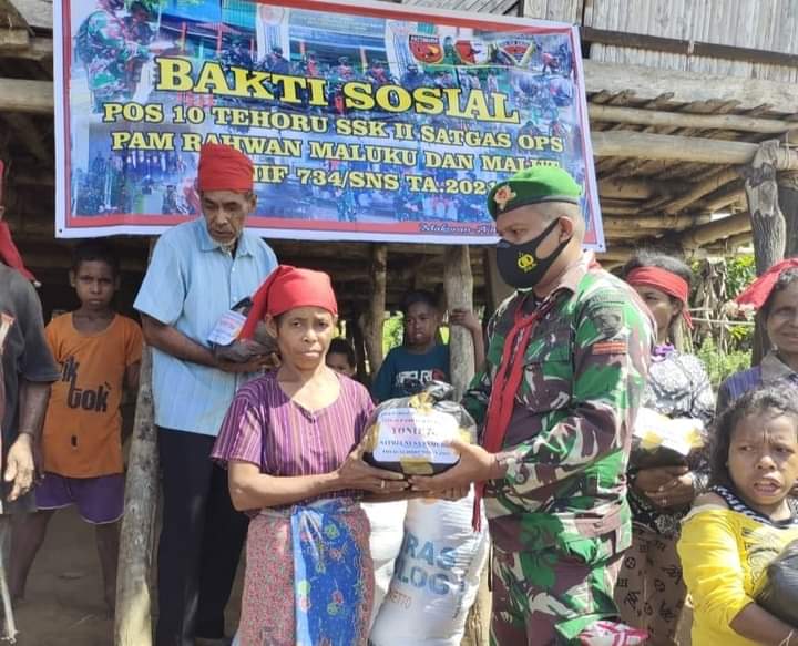 “Kegiatan Bakti Sosial ini dipimpin langsung oleh Danpos Tehoru Letda Inf M. Lutfi Cahya Perwira beserta 6 personil pos Tehoru lainnya dengan harapan kegiatan ini dapat membantu warga masyarakat khususnya dalam kebutuhan hidup sehari – hari walaupun semuanya jauh dari cukup.