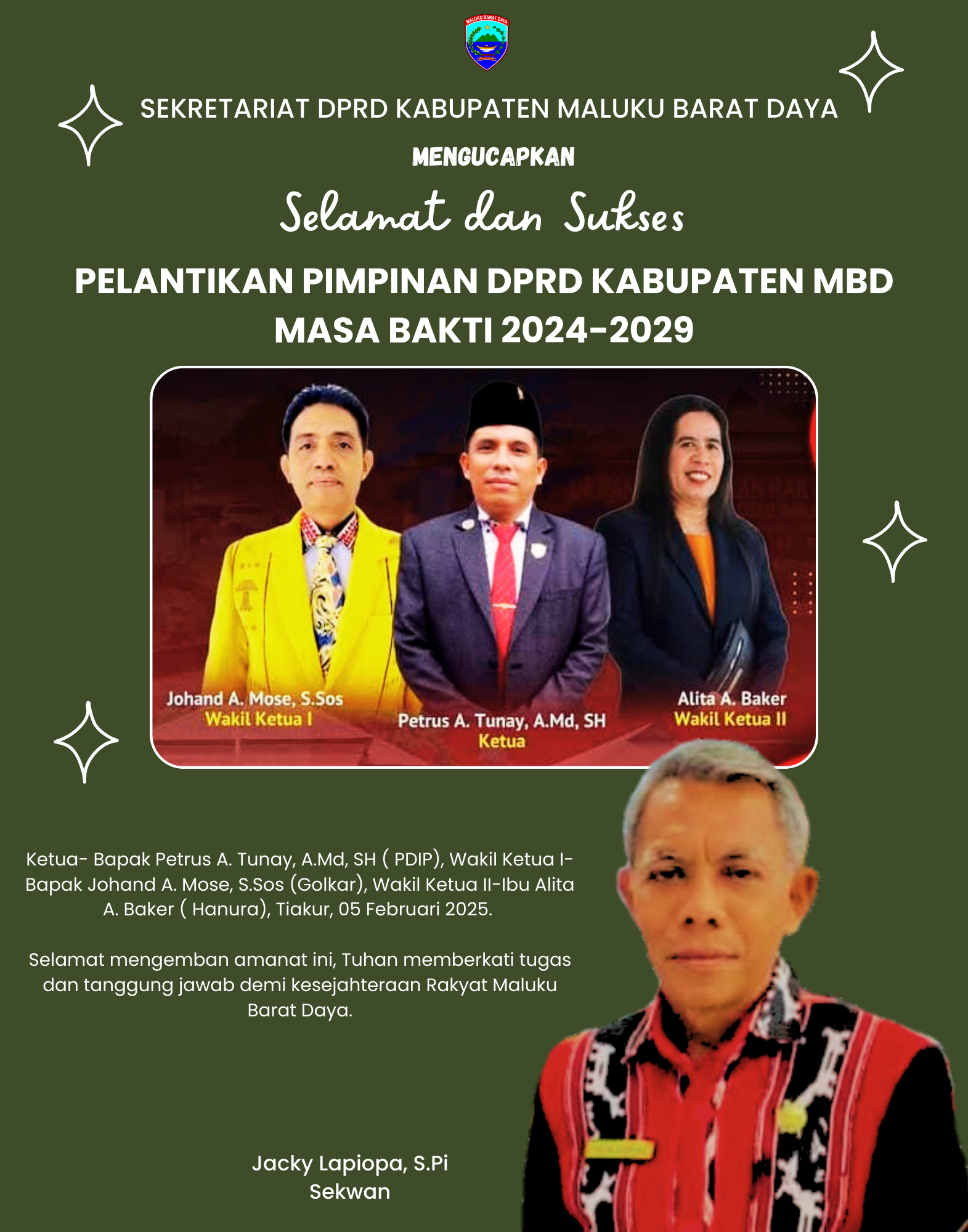 Sekretariat DPRD Kabupaten MBD Mengucapkan Selamat Atas Pelantikan Pimpinan DPRD Kabupaten MBD Periode 2024 – 2029 adminFebruari 5, 2025504 Dilihat Post Views: 504 Pos terkaitPolres Bursel Usut Kasus Penganiayaan Antara MS dan DM“Sampah Jadi Uang atau Jadi Penyakit? Apries Gaspersz Angkat Suara, Tapi Warga Masih Santai”Angkot Tak Layak Otemer-Saumlaki Dikeluhkan, Warga Minta Dishub dan Forkopimda Tanimbar Turun TanganHmmm, Demo atau Drama? Ketika Isu Lama Mendadak “Hidup” di Bursa Sekot AmbonWali Kota Ambon Buka Seleksi Sekkot: Transparansi Diuji, Integritas DipertaruhkanPANAS! Duel Sekot Ambon Makin Sengit — Apries Gaspersz Muncul sebagai Penantang Paling Berani
