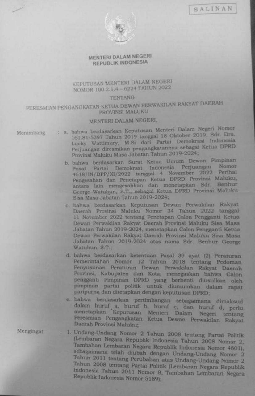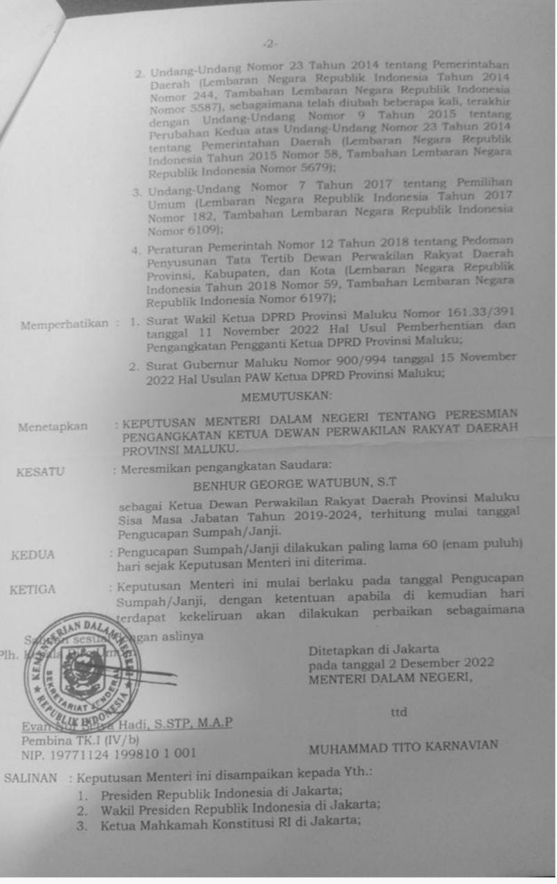 Dewan Perwakilan Rakyat Daerah Provinsi Maluku Nomor 34 Tahun 2022 tanggal 11 November 2022 tentang penetapan calon Pengganti Ketua dewan perwakilan rakyat daerah Provinsi Maluku sisa masa jabatan tahun 2019-2024, menetapkan calon pengganti ketua dewan perwakilan rakyat daerah provinsi Maluku sisa masa jabatan tahun 2019-2024 atas nama saudara Benhur George Watubun, S.T
