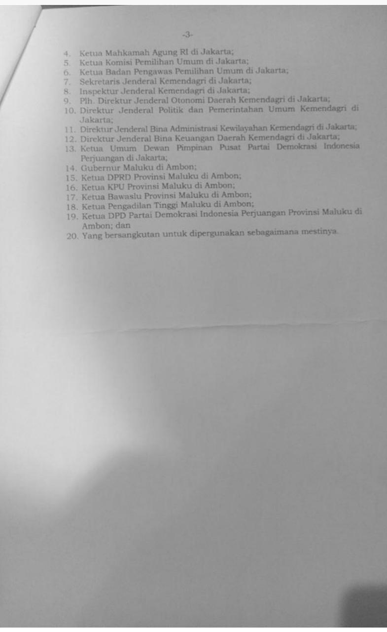 A. Bahwa berdasarkan Keputusan Menteri Dalam Negeri Nomor 161.81-5397 tahun 2019 tanggal 18 Oktober 2019, Saudara Drs Lucky Wattimury, M.Si dari Partai Demokrasi Indonesia Perjuanga (PDIP) diresmikan pengangkatannya sebagai Ketua DPRD Provinsi Maluku masa jabatan tahun 2019-2024.