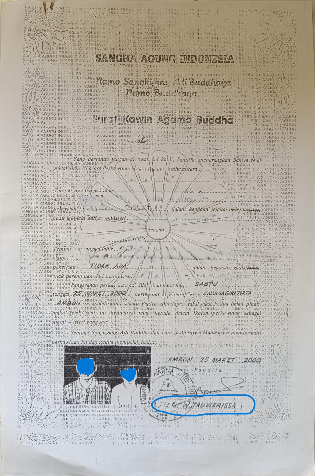 MX.COM, Ambon, Tindakan melegalkan Perkawinan dengan Blanko Surat Kawin Agama Budha, mengatasnamakan Pandita tertanda tangan basah dan cap Vihara, hasil investigasi di blanko tahun 2000, 2002 dan 2022. Dalam status kePanditanya Saudara Welhelmus Jauwerissa, merujuk pada surat Nomor 010/DPP MBI/2025, lampiran 2 lembar, perihal tanggapan surat tanggapan surat nomor 006/VSGT/XI/2025 tentang permohonan Data Pandita di Maluku, dari Pengurus Pusat Perkumpulan Majelis Buddhayana Indonesia (MBI) kepada Budi Lee Santoso Ketua Vihara Swarna Giri Tirta. Ternyata Nama Welhemus Jauwerissa tidak ada.