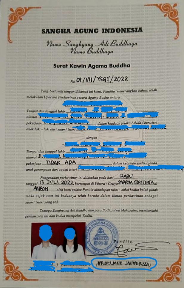 Dimana, dipertegaskan “nama yang tersebut didalam surat (welhemus Jauwerissa tersebut bukan Pandita ataupun Pengurus Majelis Budhdayana Indonesia Provinsi Maluku. Dan Sangha Agung Indonesia tidak pernah menerbitkan surat keterangan perkawinan) yang disampaikan. TTD Amin Utarid, ST (Ketua Umum) dan Marga Canto Santosa, SE.,MM (Sekjen)