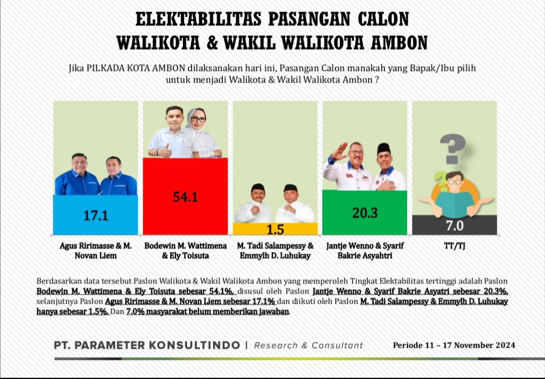Ambon,,Malukuexpress.com-Lembaga Survei PT. Parameter Konsultindo research dan Consultant, merilis hasil survei peta elektoral Pilkada Kota Ambon, periode 11-17 November 2024.