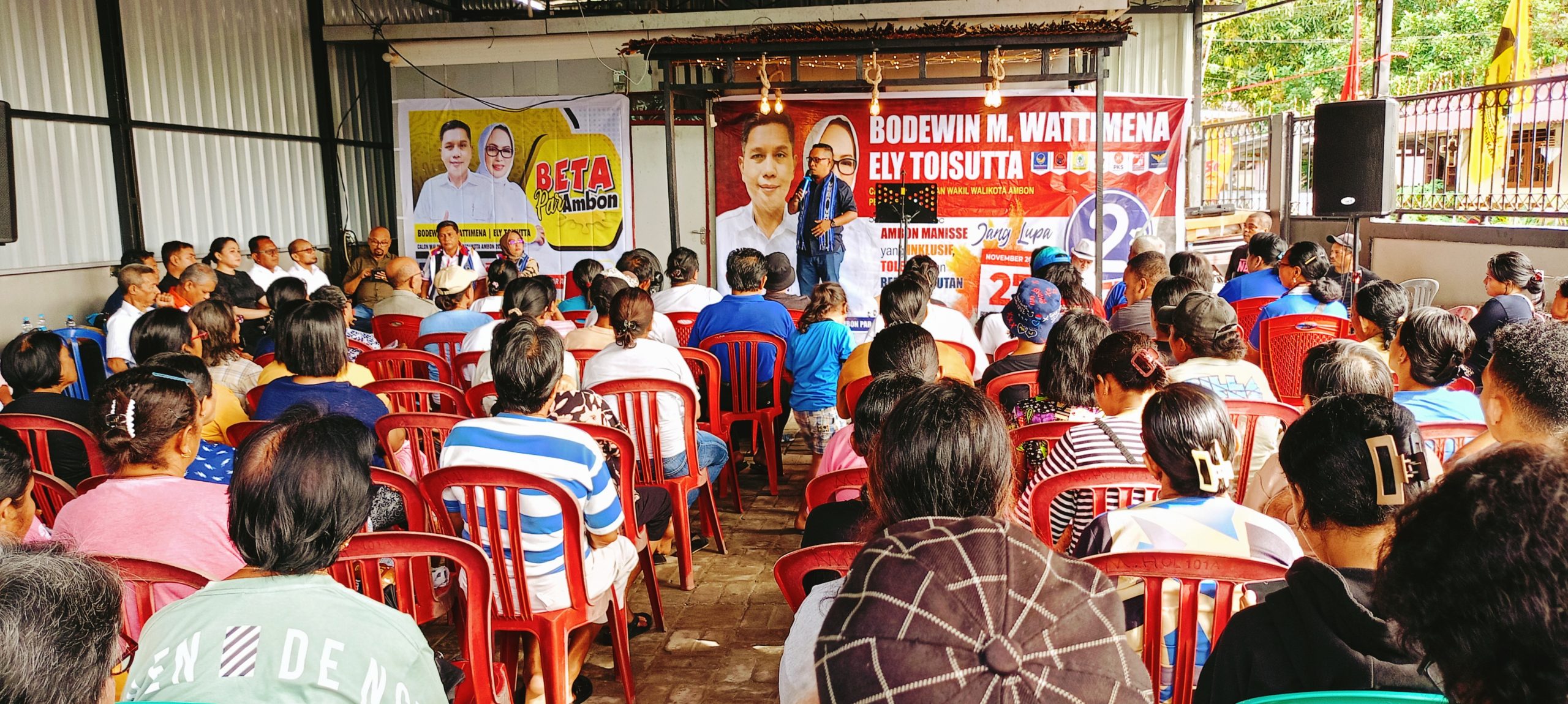 Ambon,Malukuexpress.com-Ketua DPD Partai Nasional Demokrasi (NasDem) Kota Ambon, Mourits Tamaela ajak masyarakat Galala – Hative Kecil memenangkan Pasangan Calon (Paslon) Wali Kota dan Wakil Wali Kota Ambon Periode 2024-2029, nomor urut dua (2), Bodewin Wattimena dan Ely Toisuta.