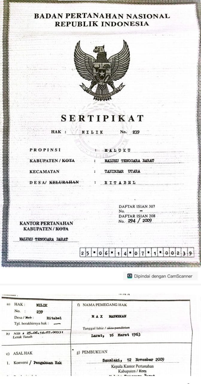 Adapun, Tana yang sudah bersertifikat 15 Tahun silam tersebut, telah memiliki sertifikat sah atas nama Max Maswekan.