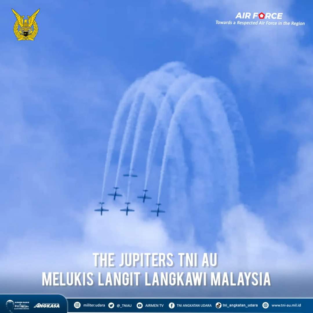 MALUKUEXPRESS.COM, Jelang dibukanya Langkawi International Maritime and Aerospace (LIMA) 2023 yang akan berlangsung pada 23-27 Mei 2023 mendatang, Tim Jupiter Aerobatik TNI AU unjuk kebolehan dan melukis langit Langkawi dengan aksi aerobatik saat melaksanakan gladi di Langkawi, Malaysia, Sabtu (20/5/23).