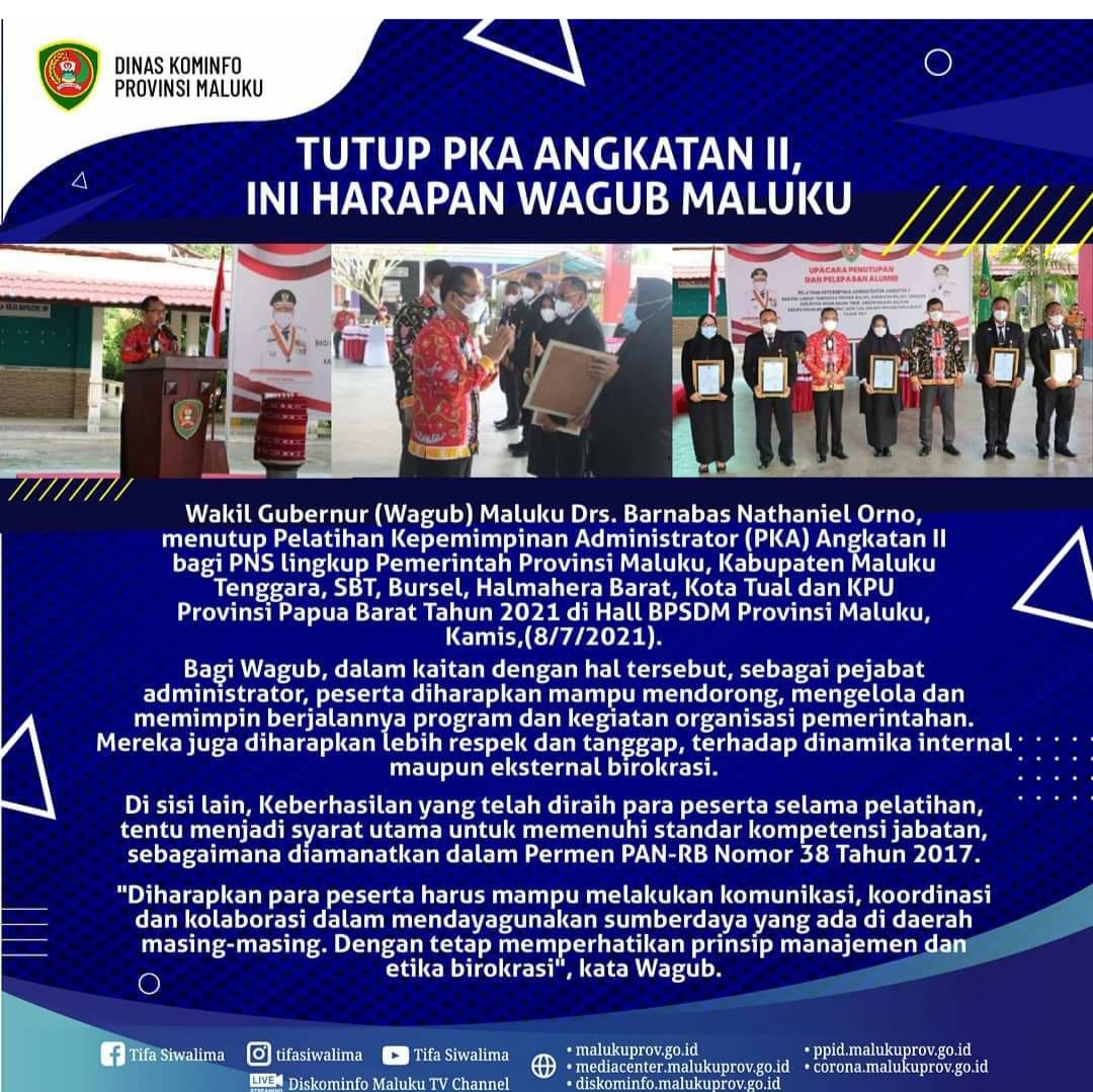 Malukuexpress.com, Wakil Gubernur (Wagub) Maluku Drs. Barnabas Nathaniel Orno, menutup Pelatihan Kepemimpinan Administrator (PKA) Angkatan II bagi PNS lingkup Pemerintah Provinsi Maluku, Kabupaten Maluku Tenggara, SBT, Bursel, Halmahera Barat, Kota Tual dan KPU Provinsi Papua Barat Tahun 2021, di Hall BPSDM Provinsi Maluku, Kamis,(8/7/2021).