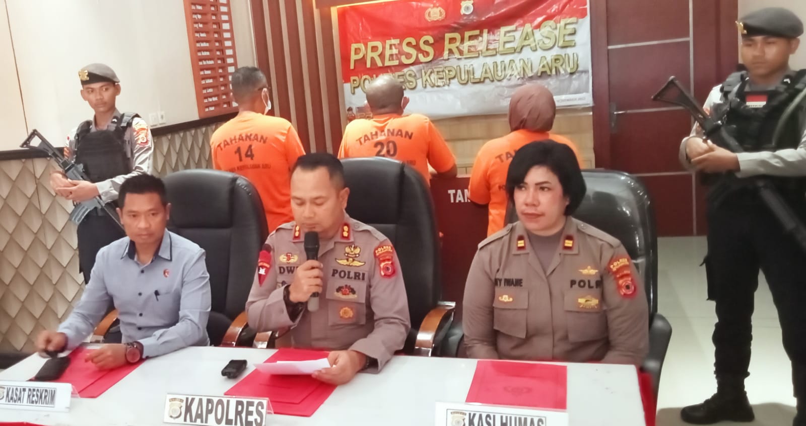 “Dari hasil perhitungan tersebut tanggal 25 Nopember 2022 kami melaksanakan gelar Perkara untuk penetapan tersangka di Dinas Ketahanan Pangan dan ada 3 orang yang kami tetapkan sebagai tersangka yaitu pertama berinisial MG, CR, dan DH. Masing-masing adalah penyedia, PPK dan KPA,”UngkapKapolresAru, DwiBactiar. Rabu 30/11/22. Dalam konferensi pers di Mapolres Aru yang didampingi Kasat Reskrim, Iptu Andi Amrin, S.Sos, MH.,dan Kasi Humas Iptu Fransisca Liantty Iwane.