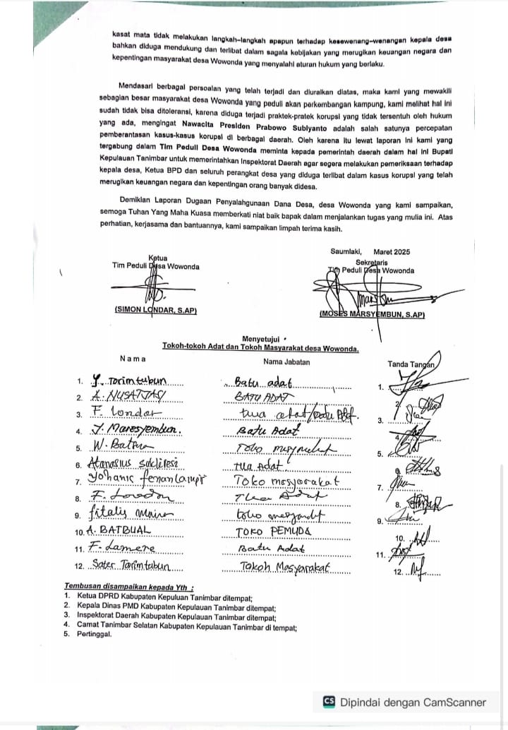 Untuk itu, sumber membeberkan bahwa, atas keberatan sejumlah besar masyarakat Wowonda, maka melalui pemuka masyarakat desa setempat yang menamakan diri Tim Peduli Desa Wowonda yang diketuai Simon Londar dan sekretaris, Moses Marsyembun ditambah sejumlah tua adat dan pemilik batu adat Kampung Wowonda sudah menandatangani surat pelaporan sekaligus melayangkan desakan mereka ke Bupati Kepulauan Tanimbar untuk meminta orang nomor satu di kabupaten julukan ‘duan lolat’ itu segera mengevaluasi Kades bersangkutan. Dimana surat tersebut tembusannya disampaikan pula kepada Ketua DPRD Kepulauan Tanimbar, pihak Inspektorat, Kepala BPMD Kepulauan Tanimbar, Camat Tanimbar Selatan. Sekaligus diminta supaya pihak Inspektorat memeriksa pula dugaan penyimpangan oknum kades tersebut.